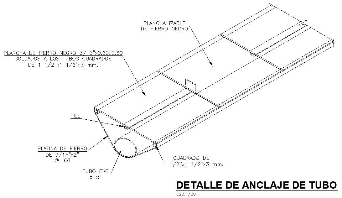 Tube anchor 3 D plan dwg file, dimension detail, naming detail, scale 1:20 detail, PVC dia 8” detail, etc.