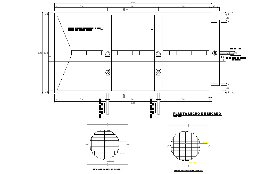 Drying bed plant plan and section autocad file, dimension detail, section line detail, naming detail, pipeline detail, etc.