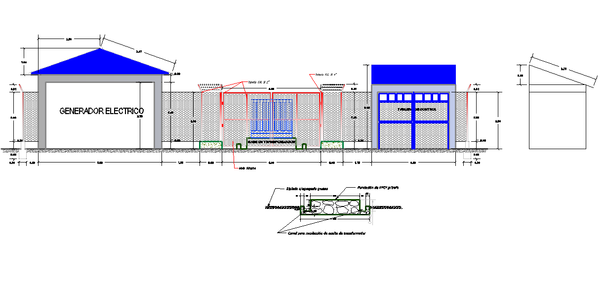 Elevation electrical substation detail dwg file, front elevation detail, dimension detail, naming detail, stone detail, hatching detail, roof plan detail, column detail, etc.