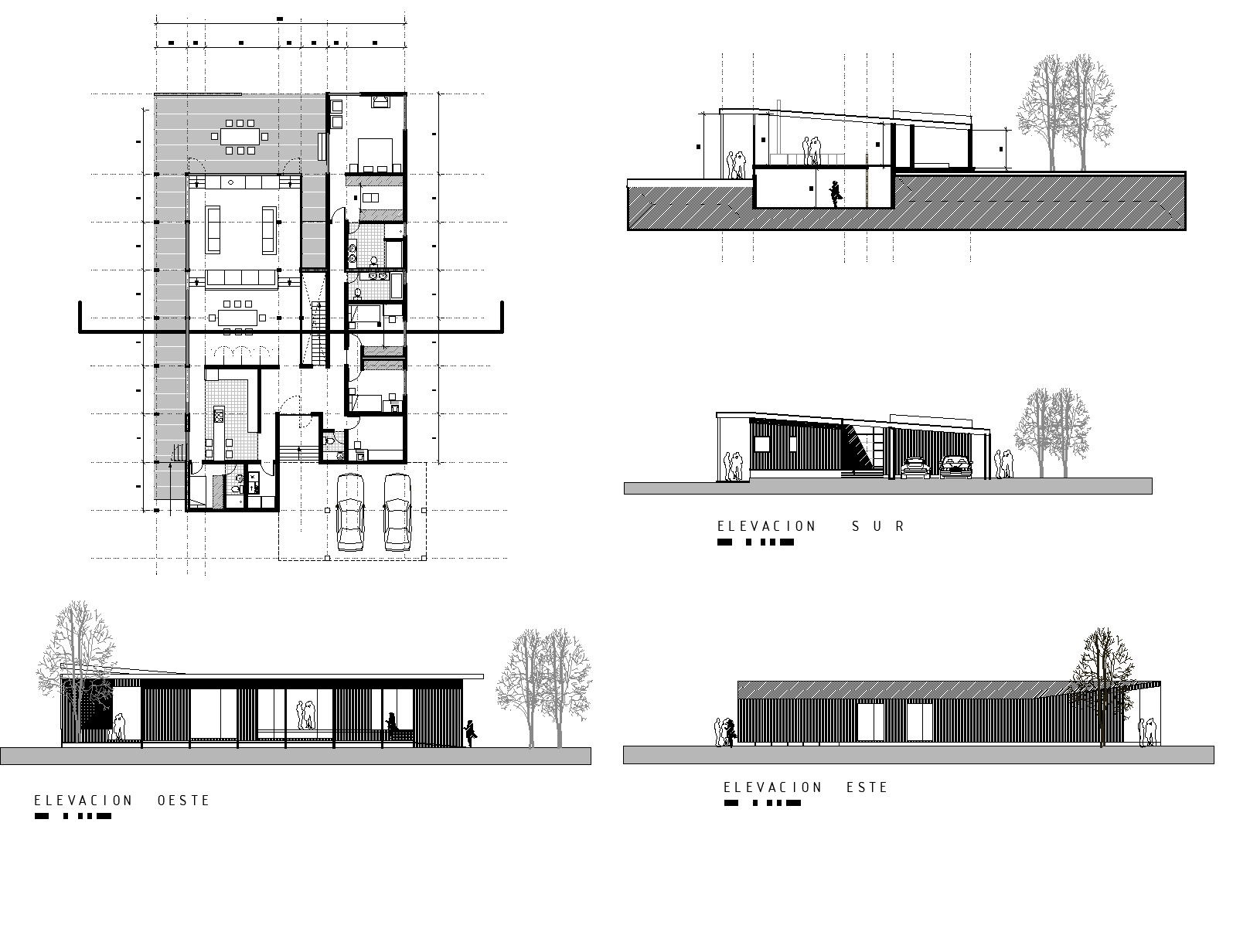 Project housing architecture plan. The top view plan with furnished detailing. The elevations of the front, side, and back elevations are also shown with furnished detailing.