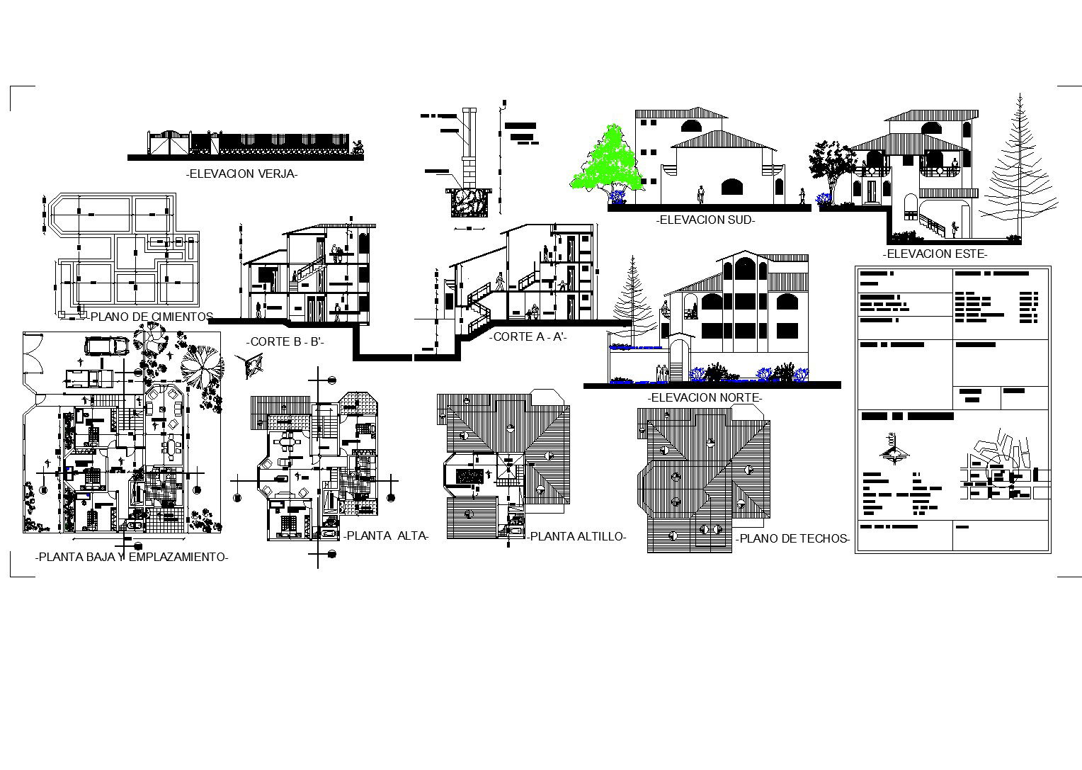 House two plants plan. The top view plan with elevations and sections. The top view plan is shown in furnished detailing.