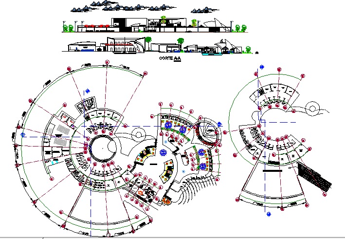 Craft market with museum architecture project that includes a detailed view of main elevation view, main sectional view, tree view, flooring view, car parking view, light pole view, layout plan details with main entry and exit gate, shops and showrooms, wall design, fast food stores, theater, fun zone, departmental stores and much more market project.