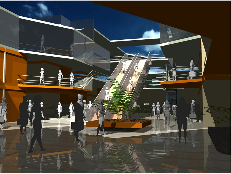 Interior and elevators design of shopping mall that includes a detailed view of flooring view, tree view, elevator view, balcony view, flooring view and much more of mall interior design.