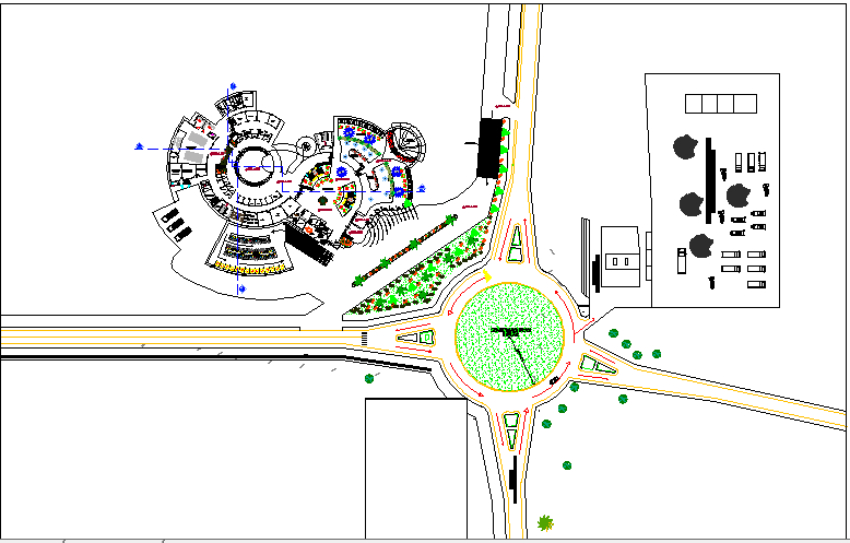 Landscaping with layout plan and auto-cad details of market that includes a detailed view of outdoor roads, green area, tree view, landscaping view, layout plan with main entry and exit gate, shops and showrooms, wall design, fast food stores, theater, fun zone, departmental stores and much more market project.