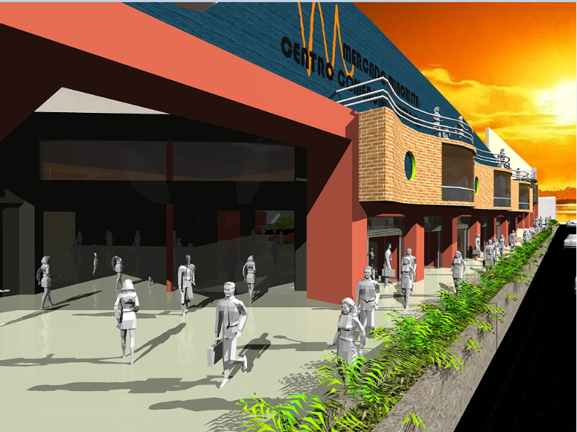3d design of front view details of shopping mall that includes a detailed view of flooring view, green area, name hoarding view, wall design, outdoor road, car parking view, tree view and much more of shopping mall design.