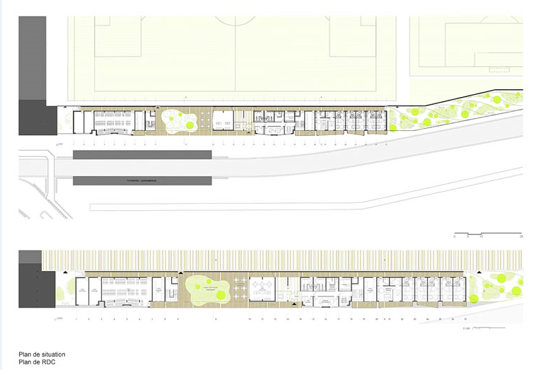 Ground and first floor layout plan details of shopping mall that includes a detailed view of ground floor, first floor, green area, tree view, shops and showrooms, fast food stores, departmental stores, general area, seating area, waiting area, staircase view, sanitary facilities and much more of layout plan details.