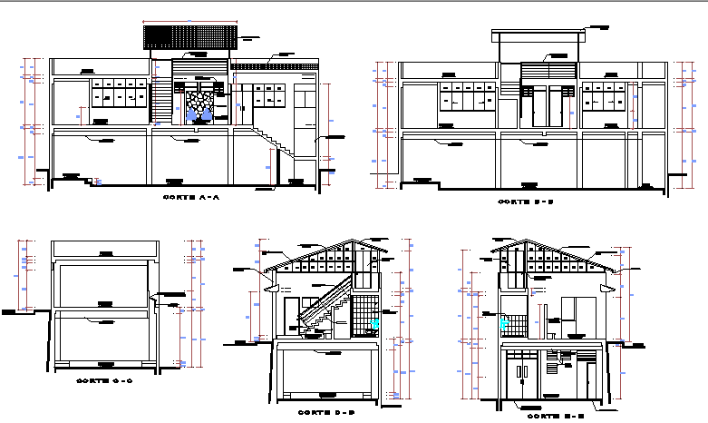 All sided elevation and sectional details of local community building that includes a detailed view of front elevation, back and cut sectional view, flooring view, doors and windows view, dimensions, staircase view, roof or terrace view and much more of building project.