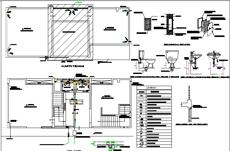 Sanitary installation details of community building floors that includes a detailed vie of sanitary sectional view, toilet sheet installation, wash basin installation, indoor doors and ventilation and much more of community building project.