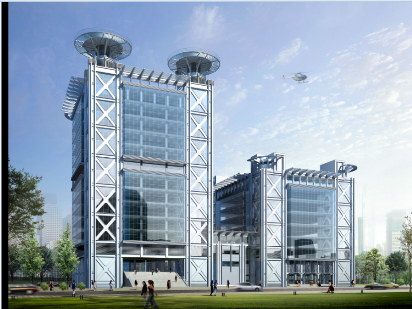 3d design of imb corporate building project that includes a detailed view of flooring view, landscaping view, terrace view, helicopter view, helipad, tree view, green area, roads and much more of building project.