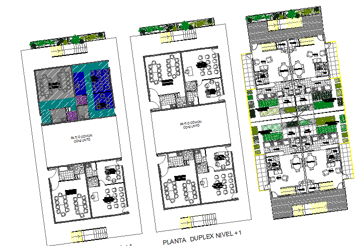 Ground, first and top floor layout plan details of residential building that includes a detailed view of main entry gate, mini garden, indoor staircase, green area, main hall, living area, single bedroom, double bedroom, kitchen and much more of building project.