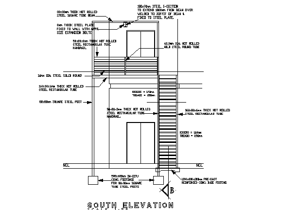 Front view detail of staircase,Sectional details with text detailing, sectional details with measurement and text is shown