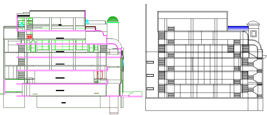 Shopping mall multi-level elevation and sectional details that includes a detailed view of front elevation view, back elevation view, flooring view, doors and windows view, staircase view, wall design, terrace view and much more of shopping mall project.