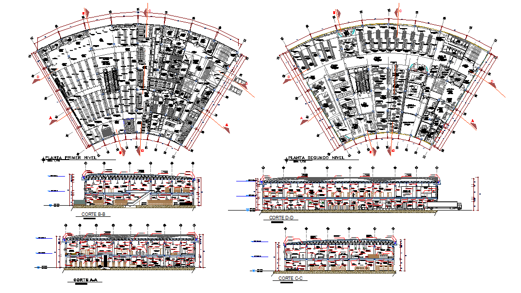 Restaurant & Hotel Architecture Lay-out design. first level plant, second level floor, display units in transparent varnished cherry wood h: 2.10 m, washable paint finish vencelatex white smoke color, collaborative plate precor deck 3 ", technical precor curved precor tr-4 e = 0.50mm. long 12.00 m, radius of curve: 0.40 m / color white zincalum astma 792 steel.