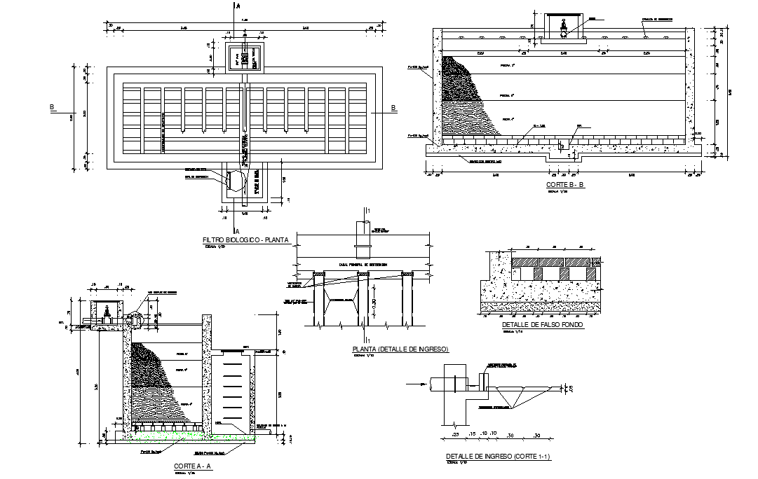 Biological filter sewage and rain water drainage plan dwg file, section line detail, dimension detail, naming detail, soil detail, scale 1:25 detail, pipe detail, etc.