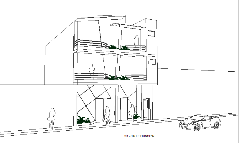 Isometric elevation view of shopping mall with bus terminal dwg file