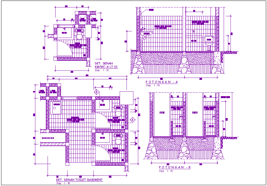 Basement toilet plan and section view for office area dwg file in plan with view of area distribution and view of ceramic area view and view of washing area with wash basin,water closet and section view with wall and wall support view and view of wash basin and water closet view with necessary detail and dimension.