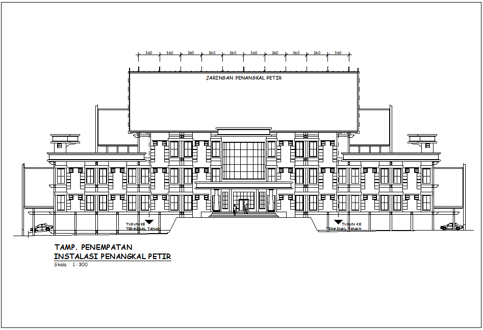 Government building elevation with network of water line dwg file in elevation with view of government building with designer entry way,column,step with two officer entry position,floor with balcony area and view of flooring view with door and window view,down of land terminal with car view with network of water detail in elevation.
