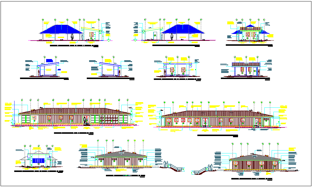 Elevation of different view with architectural view for office dwg file in elevation with view of floor, wall,door and window view wall support view,terrace area,stair view,door and window schedule with number and necessary dimension