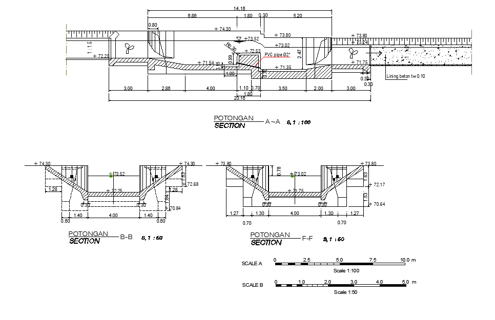 Section irrigation construction plan autocad file, section A-A’ detail, section B-B’ detail, section F-F’ detail, scale 1:100 detail, dimension detail, naming detail, leveling detail, concert mortar detail, hatching detail, etc.