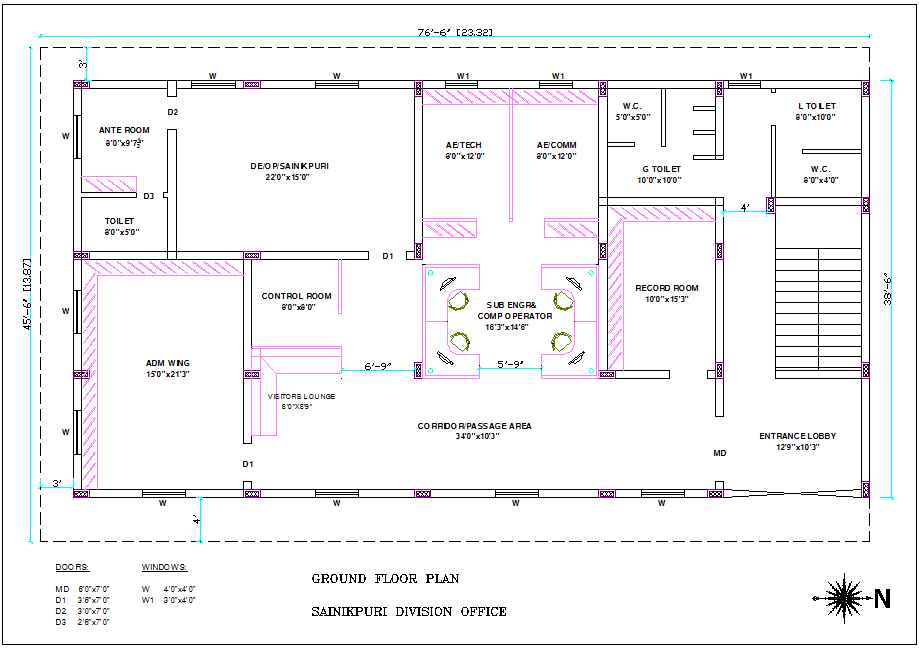 Soldier's division office ground floor plan with architectural view with door and window mounting position dwg file in ground floor plan with view of soldier room view,control room,ADM wing, record