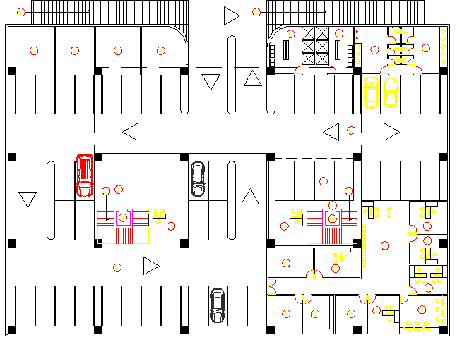 Ground floor layout plan detail of regional bank that includes a detailed view of car parking view, indoor staircase, service department, recurring department, reception desk, departmental desk, general hall, employee cabin, manager cabin, dining area, sanitary facilities and much more of bank layout.