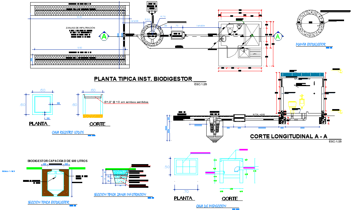 Typical plant is a biodigest plan autocad file, section line detail, dimension detail, naming detail, tank plan and section detail, section A-A’ detail, cut out detail, etc.