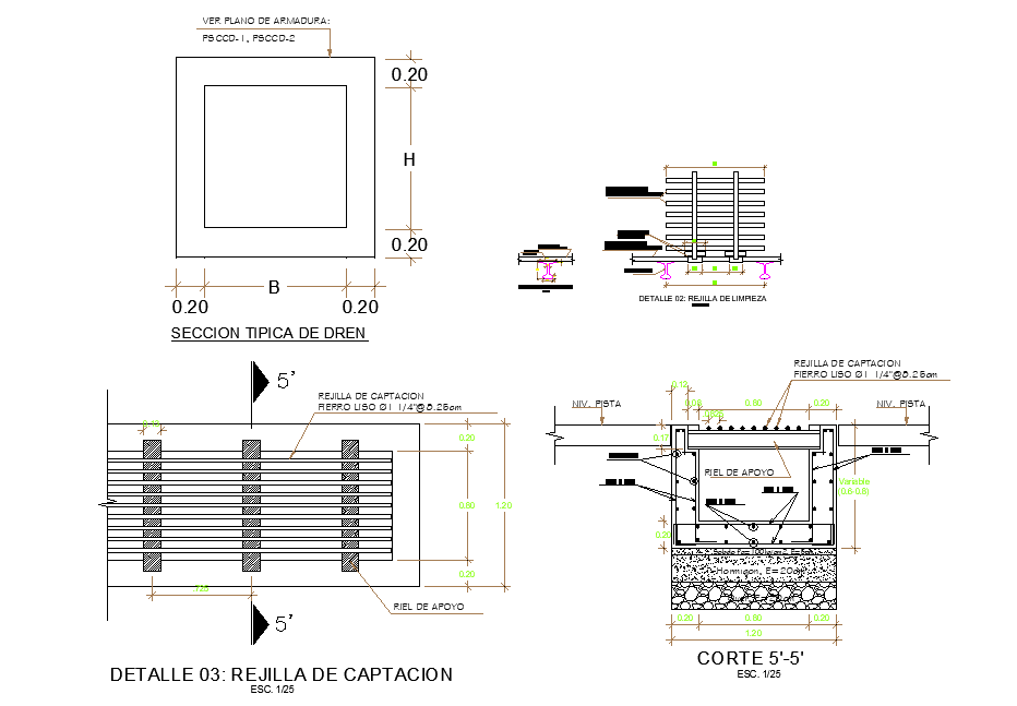 Catchment grid plan and section dwg file, section line detail, dimension detail, reinforcement detail, bolt nut detail, hatching detail, etc.