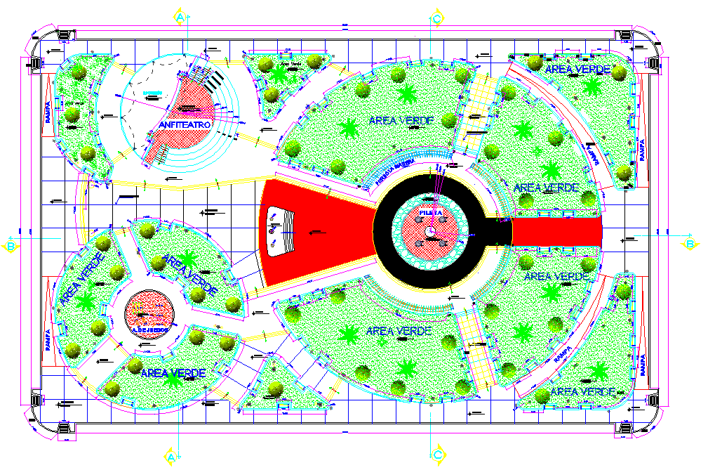 Social projection park layout file, landscaping detail in tree and plant detail, naming detail, stone detail, section line detail, naming detail, dimension detail, stair detail, etc.