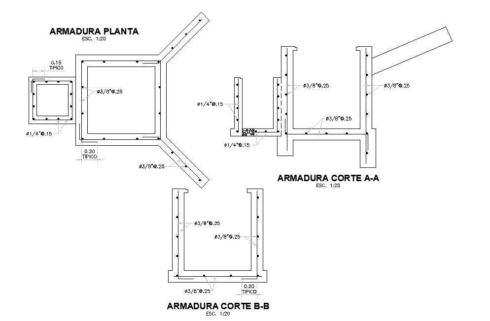 Catchment plan and section layout file, scale 1:20 detail, dimension detail, bolt nut detail, naming detail, reinforcement detail, etc.
