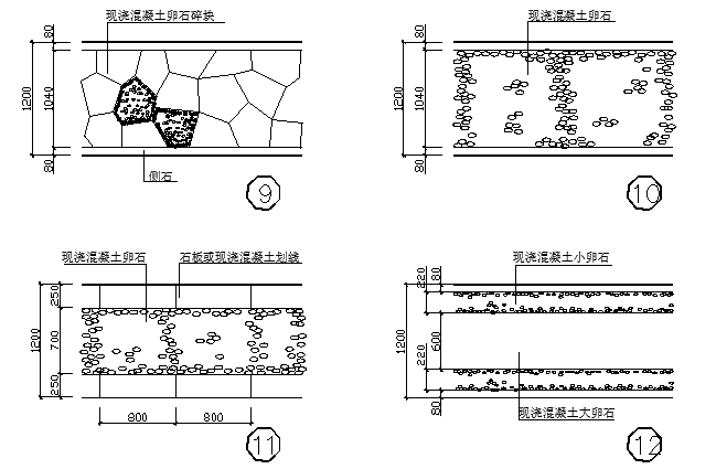 Pebbles construction of walkway,Different types of walkway details, Architecture plant parkway details, here there is sectional detail of parkway details , with text detailing
