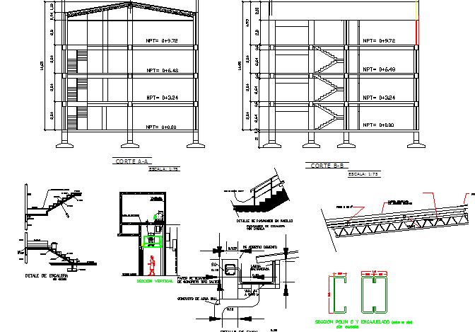 Cut sectional view with staircase construction details of office building dwg file