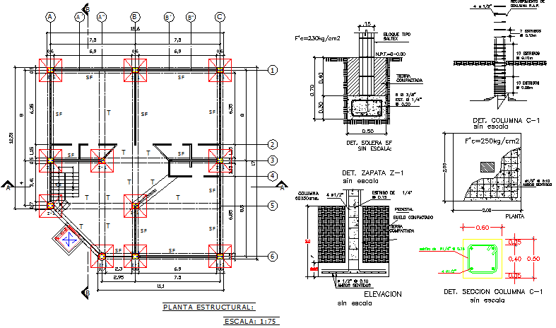 Foundation plan with constructive details of office building that includes a detailed view of foundation plan of footings, general layout plan details, beam construction details, dimensions, measures, floor construction and much more of office building project.