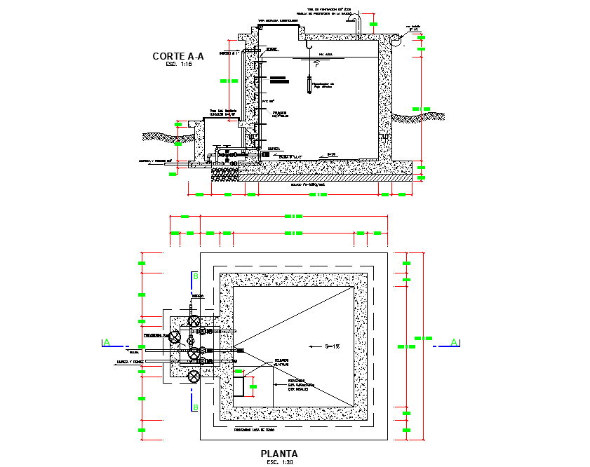 Booth valve plan and section dwg file, section A-A’ detail, dimension detail, naming detail, hatching detail, soil detail, valve detail, scale 1:20 detail, etc.