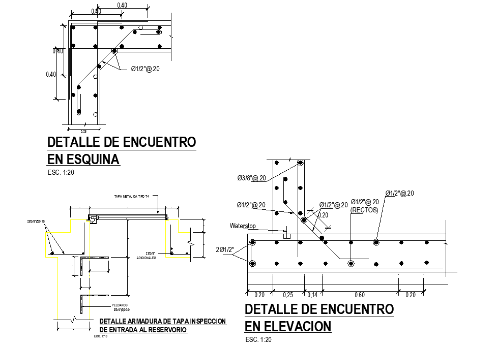 Corner meeting detail dwg file, scale 1:20 detail, dimension detail, naming detail, reinforcement detail, bolt nut detail, etc.