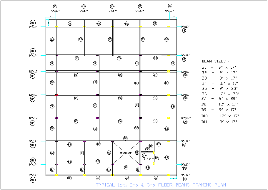 Beam framing plan for first to third floor with size of structure view for office area dwg file