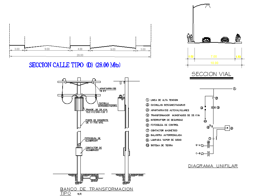 Transformation bank plan and section autocad file, diagram flow detail, dimension detail, street light detail, car detail, etc.