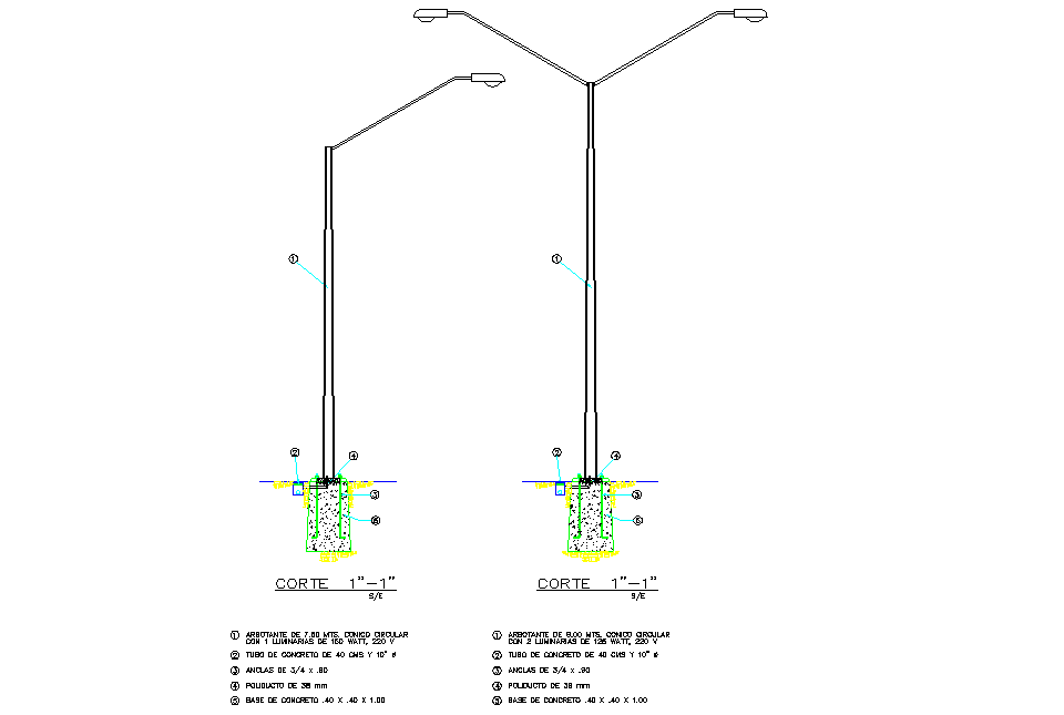 Street light elevation detail dwg file, numbering detail, naming detail, specification detail, concrete mortar detail, etc.