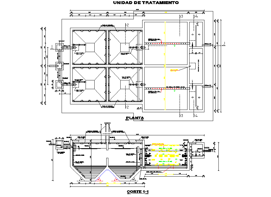 Treatment unit plan and section layout file, dimension detail, naming detail, section 1-1 detail, cut out detail, etc.
