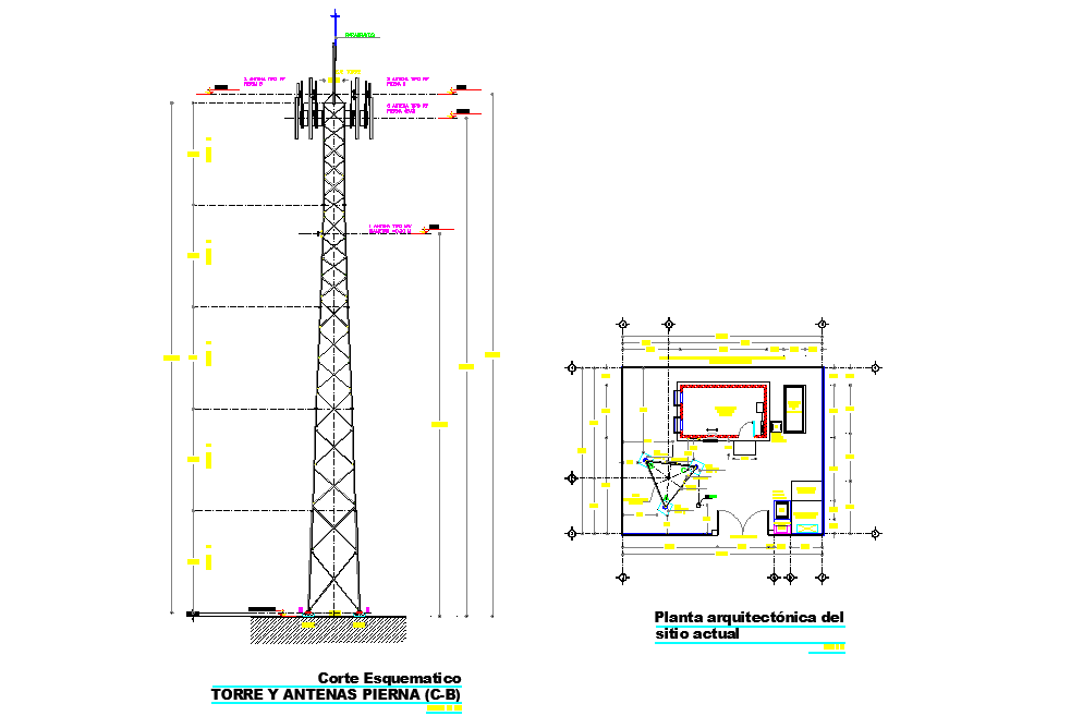 Tele communications tower autocad file, centre line plan detail, dimension detail, plan and section detail, naming detail, furniture detail in door and window detail, etc.