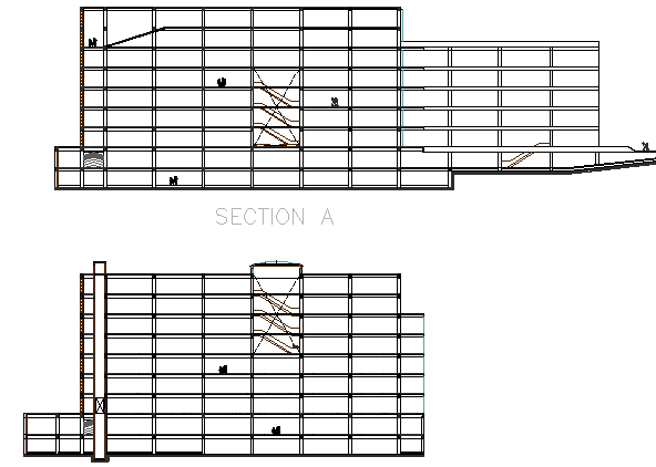 Multi-story shopping mall sectional view details that includes a detailed view of front section view, back section view, flooring view, staircase view, wall design and much more of shopping mall project.