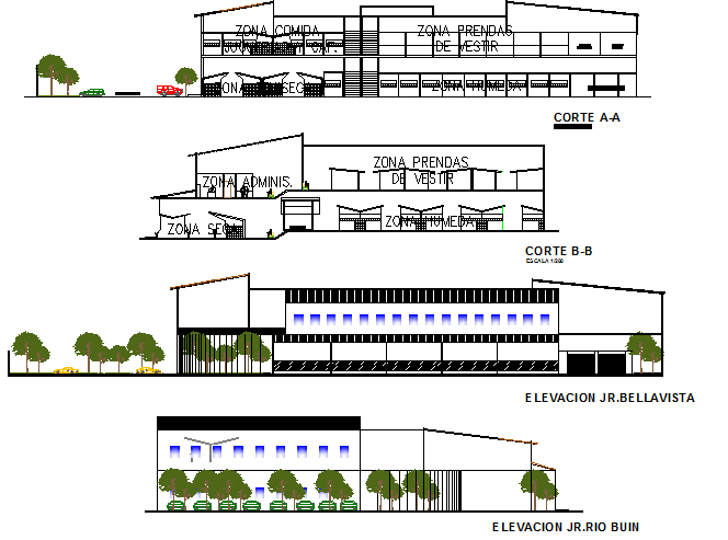 Front and back elevation and section view of shopping center that includes a detailed view of front and back elevations, front and back sections, flooring view, doors and windows view, staircase view, car parking view, tree view, wall design and much more of shopping center project.