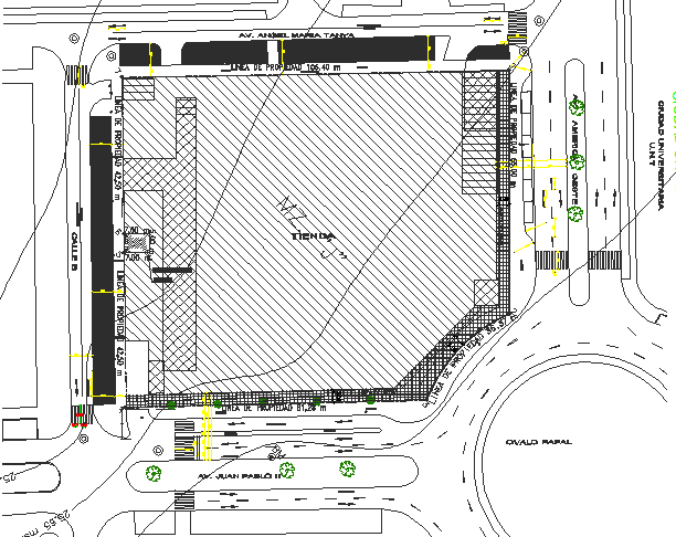 Landscaping with site plan details of shopping center that includes a detailed view of outdoor roads, indoor roads, green area, garden, tree view, landmarks, location map and much more of shopping center project.