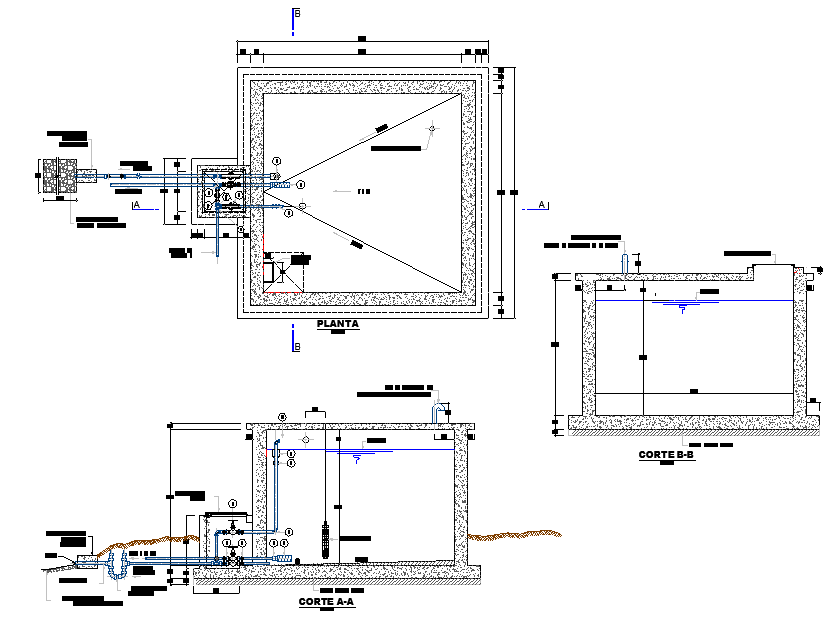 15 m3 reservoir plan and section autocad file, section A-A’ detail, section B-B’ detail, dimension detail, naming detail, section line detail, dimension detail, concrete mortar detail, pipe line detail, etc.