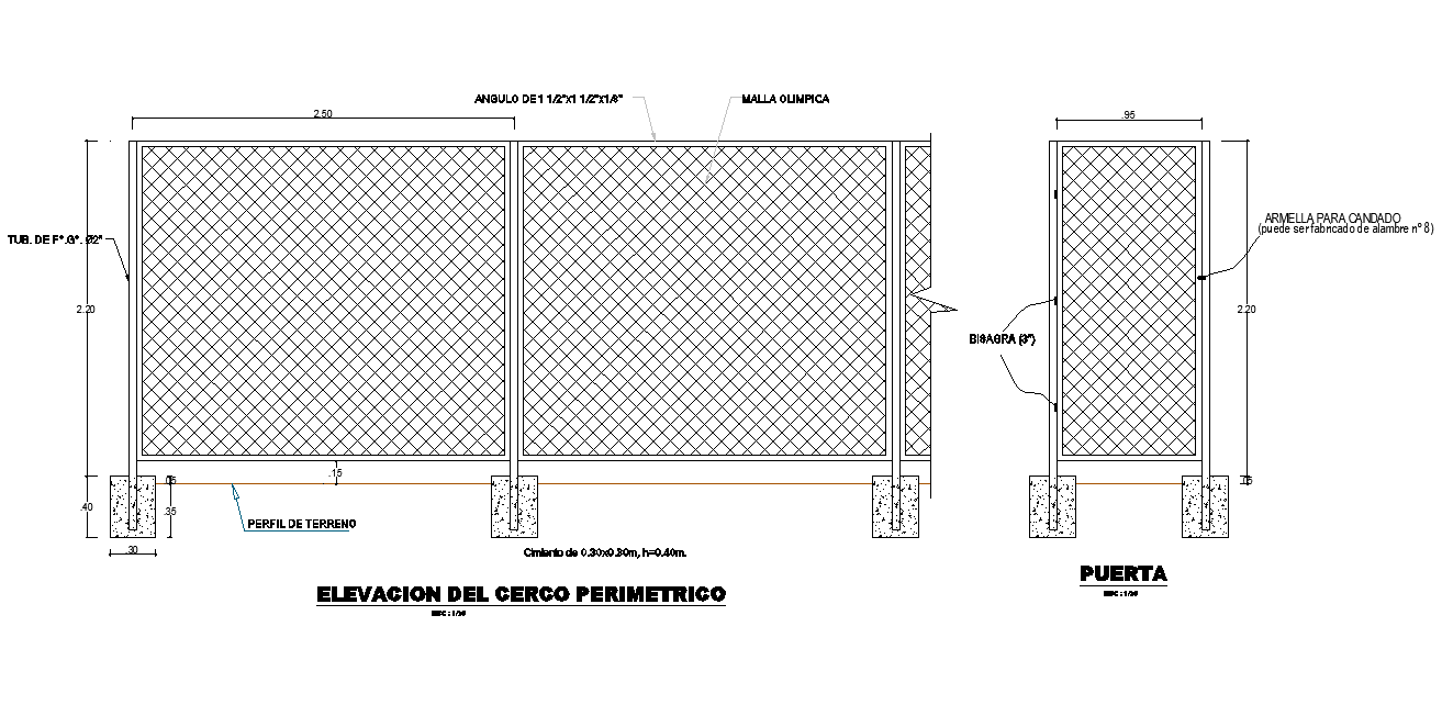 Lifting fence permethric autocad file, elevation and section detail, hatching detail, scale 1:20 detail, concrete mortar detail, etc.