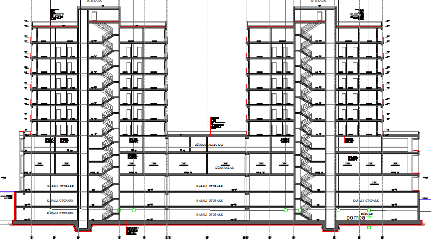 Main sectional view of multi-story shopping mall with bridge that includes a detailed view of main sectional view, flooring view, staircase sectional view, doors and windows view, shops and showrooms, sanitary facilities and much more of shopping mall project.