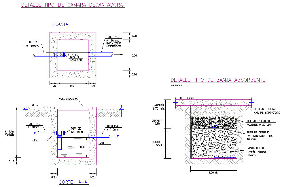 Decanting chamber plan and section autoacd file, dimension detail, naming detail, stone detail, concrete mortar detail, pipe line detail, etc.