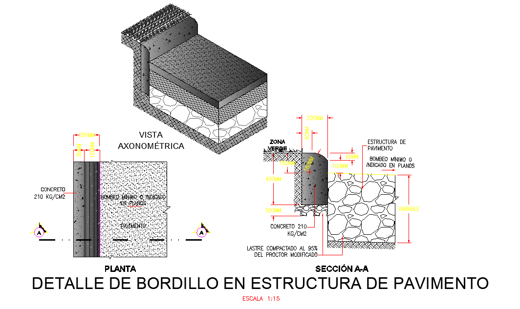 Curb detail in pavement structure layout file, scale 1:15 detail, dimension detail, naming detail, stone detail, section line detail, hatching detail, etc.