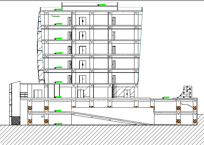 Back sectional view details of multi-level office building that includes a detailed view of flooring view, doors and windows view, wall design, terrace view and much more of building section.