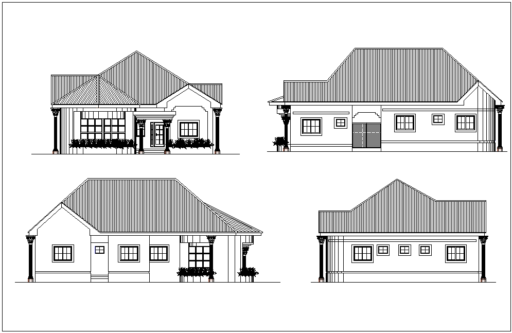Different side elevation of three bedroom with architectural view dwg file in elevation with view of floor view,wall and wall support view and designer support view,door and window view and floower