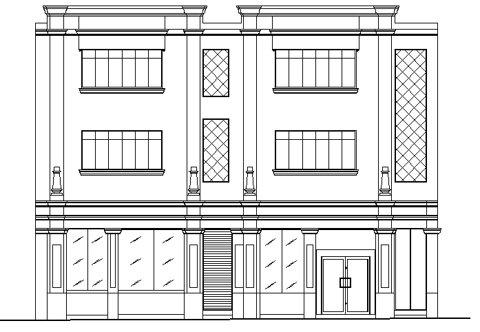 Main elevation view of bank agency office building that includes a detailed view of main elevation, flooring view, wall design, doors and windows view and much more of back elevation.